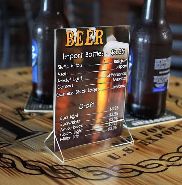 This clear, two-sided Acrylic Tabletop Menu Card Holder is the perfect addition to your bar, hostess desk, or dining room for displaying drink menus, happy hour deals, signature appetizers and more. It’s made of one continuous piece of heavy-duty acrylic, and the top and sides open easily for sliding in content. This menu card holder is easy to maintain with an occasional damp cloth to remove dirt and debris.