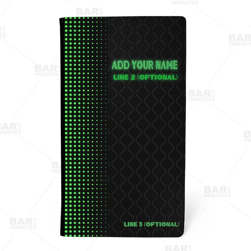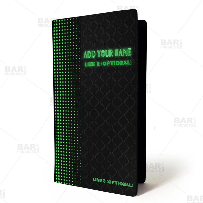 These check holders are constructed from a high quality leather and polyester material combo on the outside, with a soft velvet lining on the interior. The face of the folder showcases a full color nightclub vibe design perfect for any type of service. The inside features 2 slots to hold checks, cash and receipts securely while the plastic slot is perfect for holding credit cards. Measures: 5.75″ x 10″.