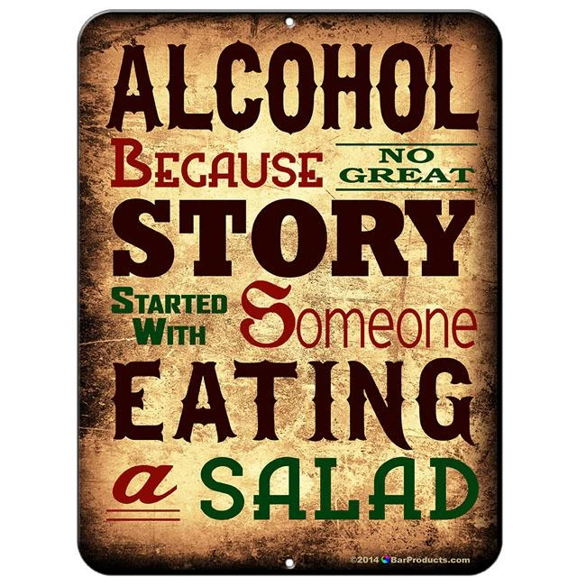 “Alcohol! Because No Great Story Started With A Salad.” The perfect sign to hang in your bar or home, reminding others just one more reason why we drink alcohol… for the stories of course!