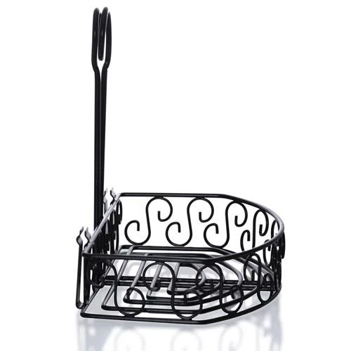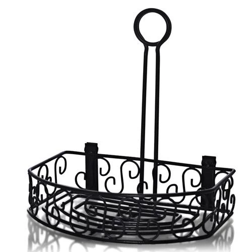 Our semi round straight back condiment caddy is the perfect way to keep your tabletops neat and organized. With these semi circle condiment baskets your customers can easily find what they need close at hand, yet the flat back lets it sit flushed against the wall, keeping the condiments out of the way and giving your guests more tabletop space. Stylish and sleek, these condiment caddies look great on any tabletop and are the perfect option for displaying your salt, pepper, sugar, ketchup, mustard or any other condiments you may offer. Built from solid metal, the condiment rack fits easily on most tabletops. You’ll be surprised by how much this semi round condiment caddy can hold, push them up against the wall, or pair them back to back. The perfect combination of functionality and style, these are great for housing and serving virtually any condiment you can think of while imparting the perfect touch of elegance and sophistication. The intricate design scrolled around the perimeter of this condiment rack effortlessly adds a classic touch of charm to any table or bar top. The back of the caddy features two clips that are perfect for holding menus or any display items. The top of the caddy features a built in ring that is perfect for displaying table numbers, menus, or any other promotional items, allowing you to advertise right at eye level. These straight back semi round condiment caddies are perfect for any bar or restaurant that needs to stay efficient and organized yet stylish.