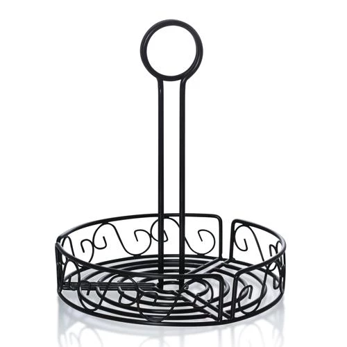 These stylish BarConic® condiment caddies look great on any tabletop and are the perfect option for storing and displaying your salt, pepper, hot sauce, ketchup, mustard and any other condiments you may offer. Made from sturdy steel, the durable composition of this condiment rack ensures its quality and longevity. With the intricate design scrolled around the perimeter, this condiment basket effortlessly adds a classic touch of charm to any table or countertop. Designed for functionality and style, this beautifully crafted tabletop accessory is perfect for neatly arranging and presenting your patrons with all of their favorite condiments. A great way to keep tables organized and uncluttered, our condiment caddy features a lovely and elegant design that transcends it to a level of stylish sophistication. The built in merchandising ring is perfect for holding table numbers, menus or promotion items, letting you advertise right at eye level. These condiment caddies are a necessity for any bar and restaurant that needs to stay efficient and organized.