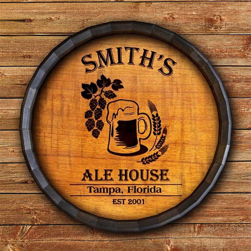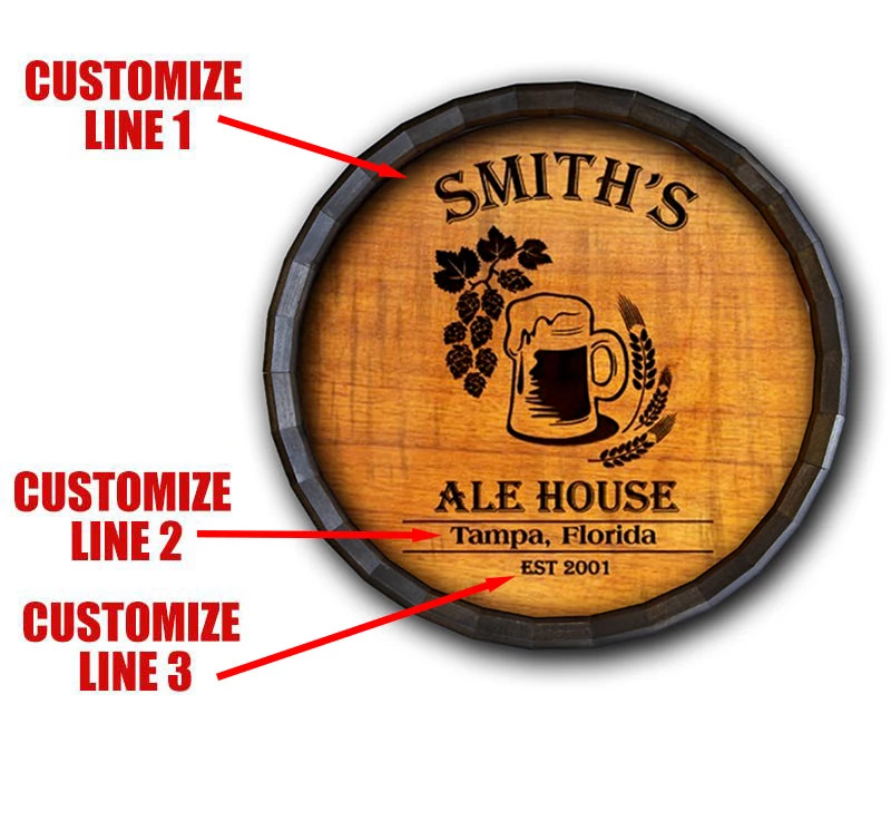 The Ale House Barrel Top Tavern Sign can be customized with any name, place, and year established. This one of a kind sign is great for bars, man caves, kitchens, and more. Each sign is made to order by skilled craftsmen, and double checked for quality before it leaves our warehouse. It is especially perfect for beer lovers and breweries. Plus, the best part is…adding your personalized information is no additional cost to you!