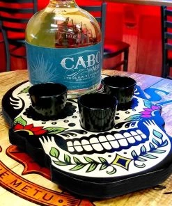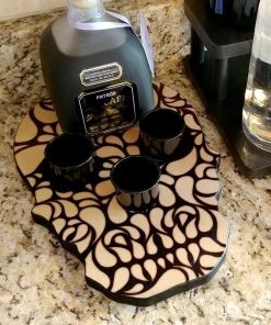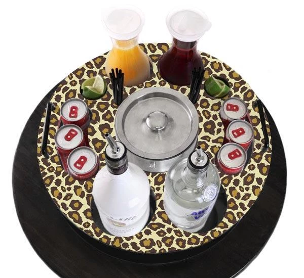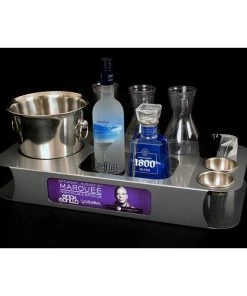 What better way to enhance the customer experience and show off your unique side than with these VIP bottle service trays? Night clubs and bars have used these Bottle Trays to up-sell premium bottles of liquor and spirits for years, and now you buy one with a fun design! The tops of these trays are made of high-quality wood and feature a graphic design of your choice–we have MANY available to choose from. The service trays are made to hold 6 cans of energy drinks, plus 2 liquor or spirit bottles, straws, 2 ramekins for fruit, 2 juice carafes, and 1 ice bucket. The handles on the side allow for servers to deliver the tray easily to any table.