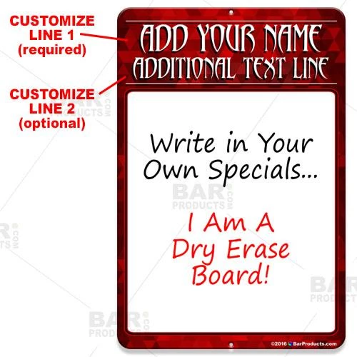 Every bar or restaurant has specials and events they need to promote… it’s what keeps you one step above the competition. There are many ways to get the word out, and this dry erase metal sign is one of the best! This metal “specials” sign is a dry erase board, so you can easily change your specials from day to day or week to week. It wipes away clean with no colored stain left behind. There are 2 small drill holes on the top and bottom, so mounting this sign securely to a wall is easy. Choose from 2 sizes: 12″ x 18″ or 9″ x 12″