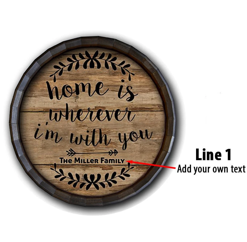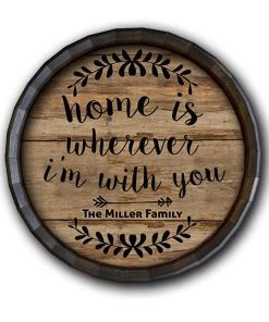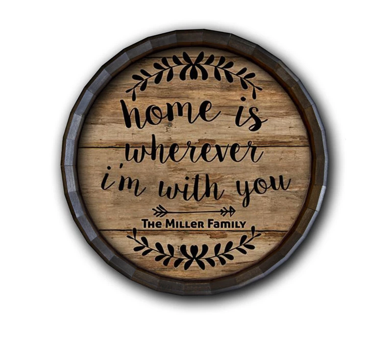 The Home is Wherever I’m with You Barrel Top is a perfect gift for newlyweds or a pair that has been together for 50 years! After-all home is wherever you are with people you love. Wood barrel signs are designed to look like the top of an wine or liquor barrel and can be hung on almost any wall. We have also left a space for you to customize this sign and really make it your own! Add your family name, favorite saying, or anything you would like. Barrel top signs are hand crafted by skilled artisans and make great birthday, holiday, or house warming presents!