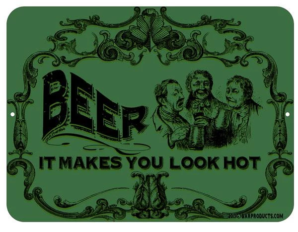 This fun metal bar sign features a retro-styled tavern theme, complete with fancy font and a trio of “old timey” gents. Most of all, it advertises the best selling point of beer: it makes you look hot! Show you sense of style and humor by displaying this instant classic on your wall.