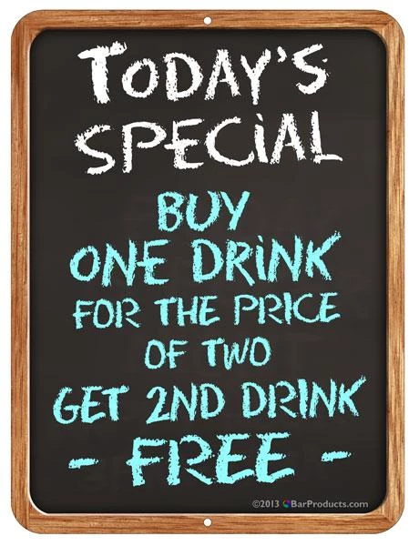 - “Buy one drink for the price of two, get 2nd drink FREE”