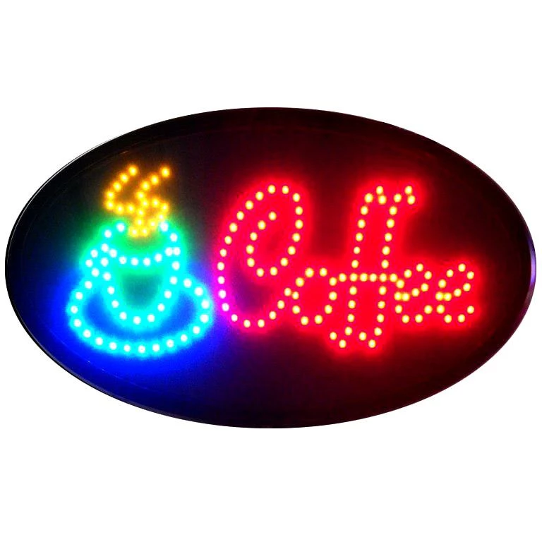 The Multicolor Coffee LED Sign is a bright addition to a coffee shop. Features 100,000 hour rated LED lights that can either be switched all on, or switched to a “running” feature, where the lights will move. Measures 24W X 12H X 1D and plugs into regular outlets with the 12V AC adapter (included).