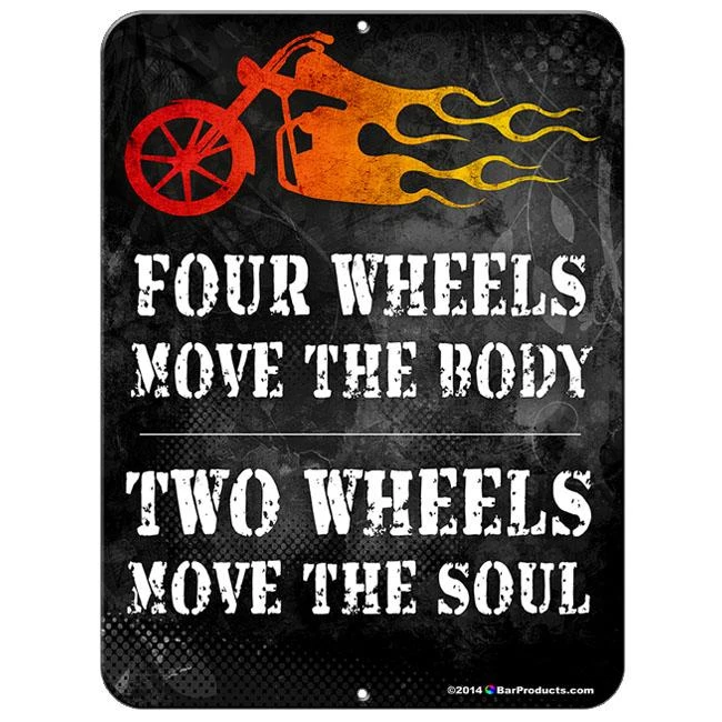 “4 Wheels Move the Body… 2 Wheels Move the Soul.” A great decor choice for any man cave, biker bar or garage.