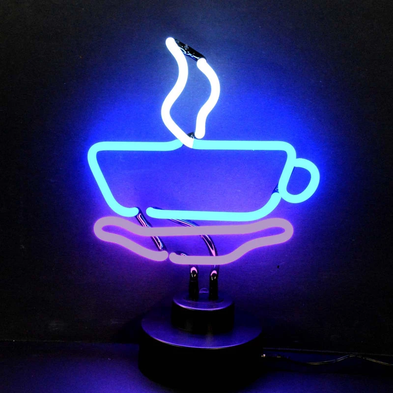 NeoneticsΒ Coffee Cup Neon Sign. It features multi-colored, hand blown neon tubing.Β The base has an on and off switch, and can be adapted to sit on a shelf or hang on a wall.Β Neonetics neon signs have a warm mesmerizing glow, and are powered by industrial strength transformers, which operate silently and more efficiently than incandescent bulbs. All you do is hang it up and plug it in β no assembly or special wiring required.Β
