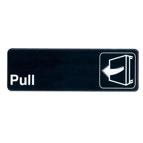The 9″ x 3″ Pull Sign is ideal for adding to doors in your establishment to let customers know which ways to enter/exit. White on black sign easily mounts with self adhesive backing.