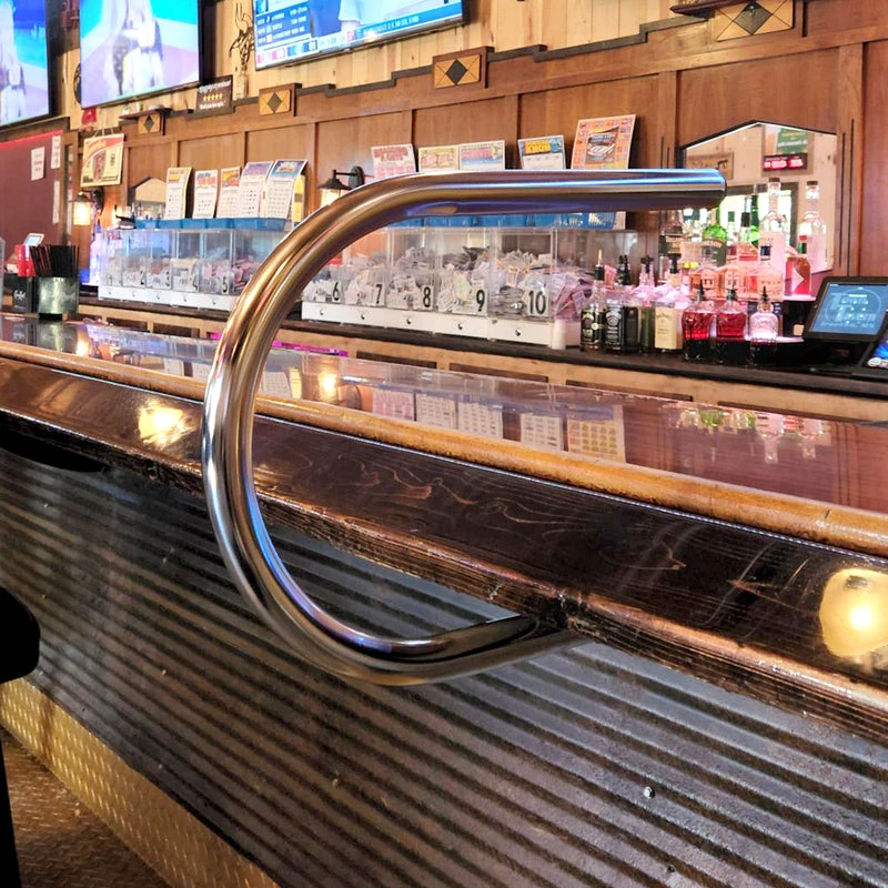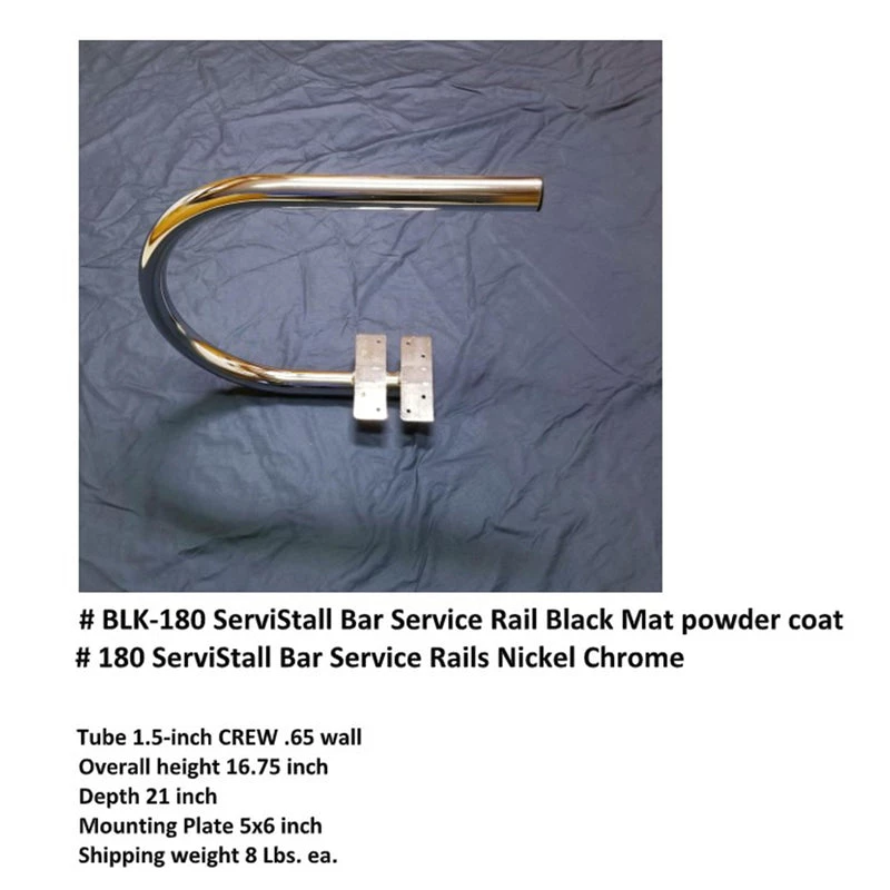 The #180 ServiStall series are single arm for flexible spacing. Use alone or in pairs. Crew Steel tubing, nickel chrome plated or black matte powder coated. Will not deface the bar. Fastens under bar ledge with four wood screws.
