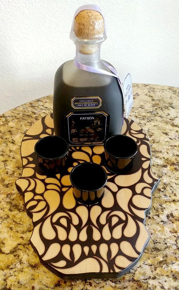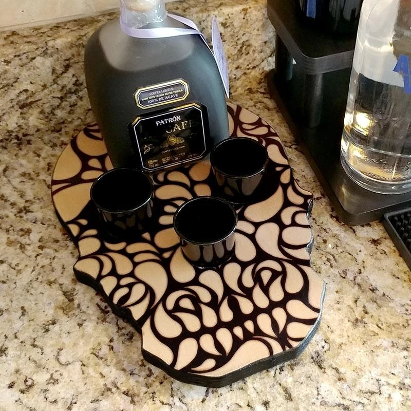 If you are someone looking to display your highlighted bottle of liquor at your next gathering in style, then this sugar skull inspired shot glass and liquor bottle caddy is right up your alley! The decorative elegant design imprinted on our high quality wood material adds a clean, yet rustic element that is sure to fit any type of decor. Display this shot tray on your bar, in your kitchen or anywhere else you care to make an impression.