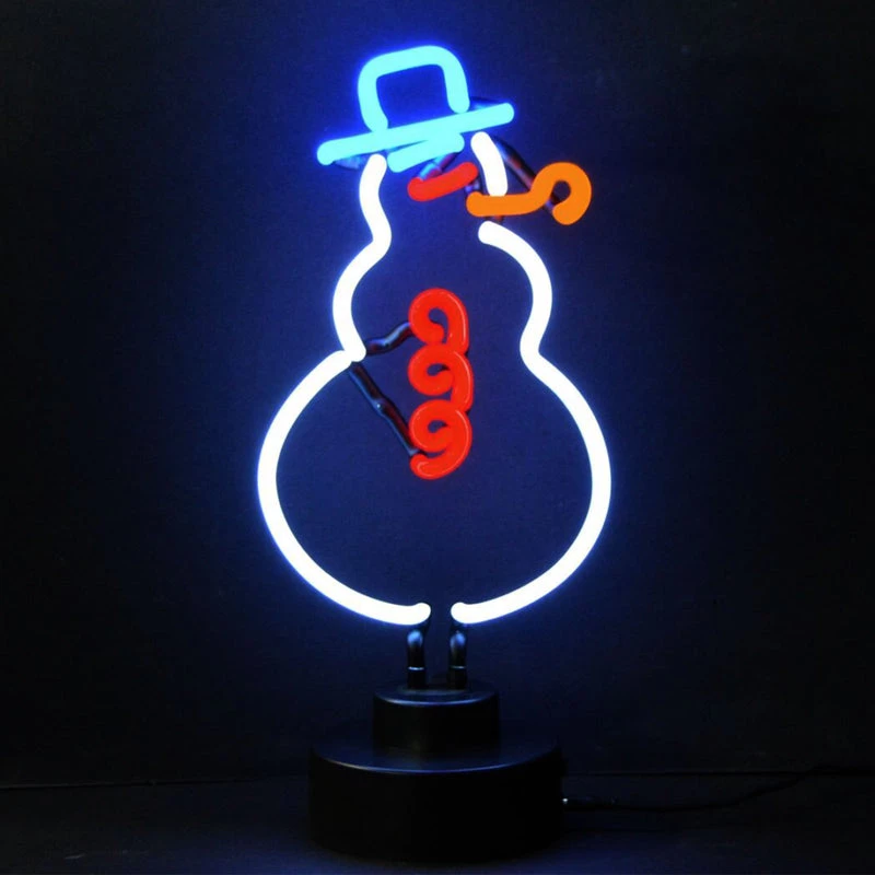 Neonetics SnowmanΒ Neon Sign. It features multi-colored, hand blown neon tubing.Β The base has an on and off switch, and can be adapted to sit on a shelf or hang on a wall.Β Neonetics neon signs have a warm mesmerizing glow, and are powered by industrial strength transformers, which operate silently and more efficiently than incandescent bulbs. All you do is hang it up and plug it in β no assembly or special wiring required.Β