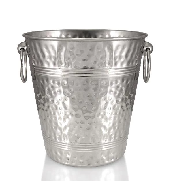 Lift your tableside wine and champagne service to a new level with this Hammered Ice Bucket. Our exclusive Hammered Bucket is an elegant essential and will bring a unique touch to your table and bar. Made of stainless steel with stunning hammered detail, rolled edges, and its convenient carrying handles provide easy transport. Stand sold separately.