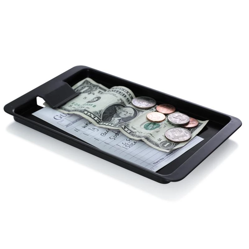 Deliver the check to your guests in style with this classic yet contemporary black plastic check presenter. This check tray allows you to easily deliver meal checks and collect payment from customers in an orderly manner. The tray keeps cards, cash and checks securely in place during transport, making it easier to keep everything neat and accounted for. Very casual, yet convenient, this black plastic tip tray adds just the right amount of style and class to your check presentation. Constructed from plastic, this tip tray is very durable and guaranteed to last. Perfect for waiters, waitresses, bartenders or anyone in the food service or hospitality field. Check trays have been known to greatly improve overall efficiency and have dramatically increase the ability of servers to function effectively and stay organized. The black color choice gives it a sleek and sophisticated style that is perfect for any bar or restaurant. Order some today!