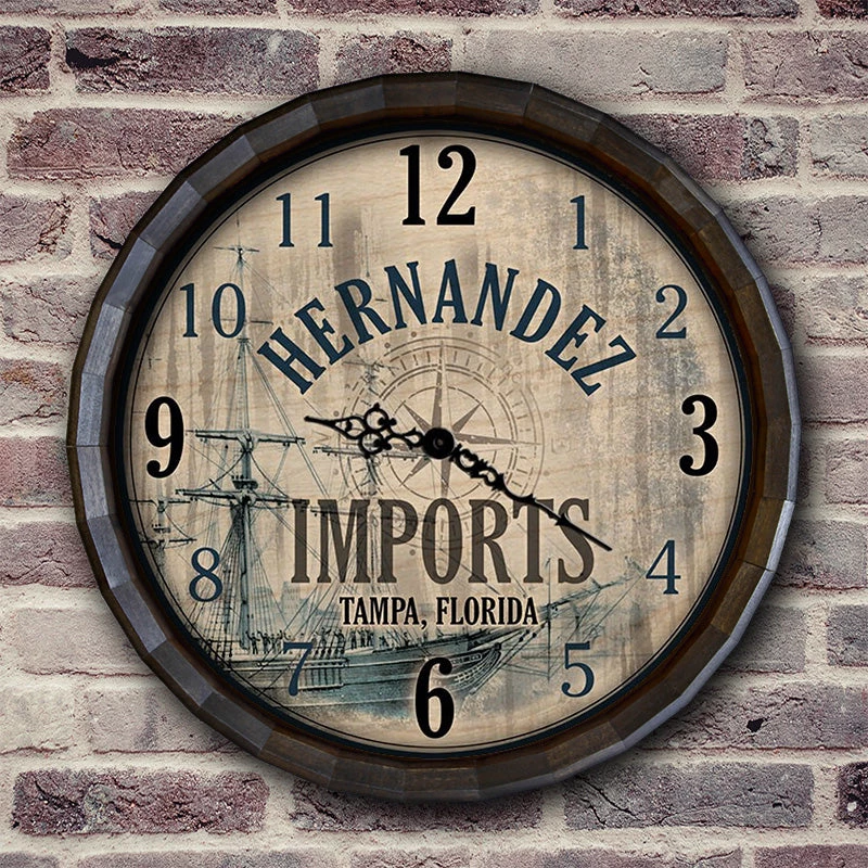 With this “Imports” template design, you have the ability to add your own name and your city / state of preference. It also makes for a great gift idea to the history buff in your life. It features a nautical design theme that beautifully blends with the barrel tops wood grains. The clock itself functions off of a mini quartz movement piece (that takes 2AA batteries – not included) and features classy, serpentine style black clock hands (hour and minute). Just like all of our wood shop products, this barrel top clock is handmade in the USA.