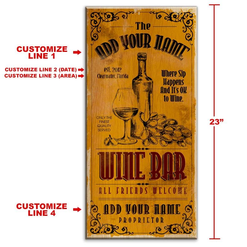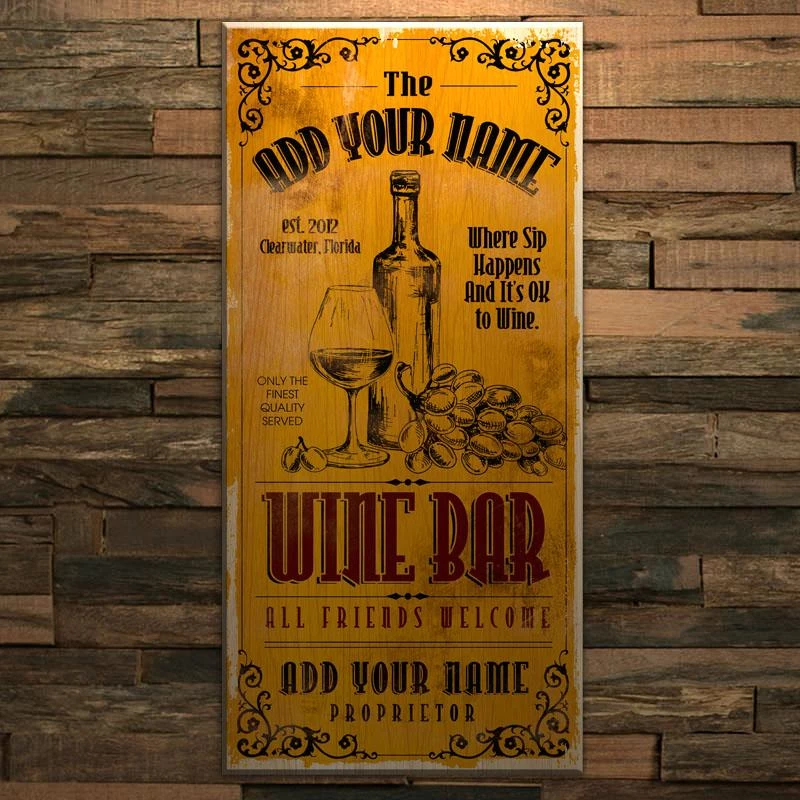 Home and bar decor can certainly set the tone for your guests. They can also make for great conversation pieces! This distressed, Vintage Style “Wine Bar” themed Wooden Sign will do just that. The best part is that it is completely customizable. All you need to do is simply type in the required fields with your text and we will custom design this very cool, distressed wooden sign just for you. Think about how excited your friends and family will be when they receive this gift personalized with their name or favorite phrase.
