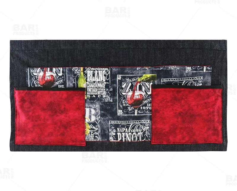 What is not to love about this adorable wine themed apron? Our designer aprons are handcrafted here in the USA and add an undeniably stylish element to your service. Made from 100% cotton, this apron is very durable and extremely high quality. It contains 5 compartments (or pockets) that is suitable for toting and organizing pens, check pads, straws and money during any serving or bartending shift. You are sure to appreciate not only the fashion statement, but also the quality and utility of this wine themed designer apron.