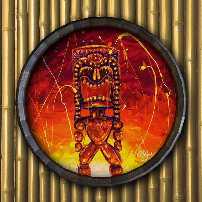 The Tiki Hot Lava Wood Barrel Top Sign or Clock features the whimsical and fun art of CBjork. This fiery Tiki man among a plethora of orange hues will look great hung anywhere! The art comes straight from painter CBjork, and even though it is a print, it looks like it was painted right on the Barrel Top!