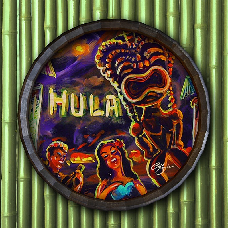 The Vintage Hula Bar Wood Barrel Top Sign or Clock features the whimsical and fun art of CBjork. This vintage Hawaii themed tiki bar will look great hung anywhere! The art comes straight from painter CBjork, and even though it is a print, it looks like it was painted right on the Barrel Top!